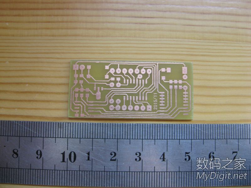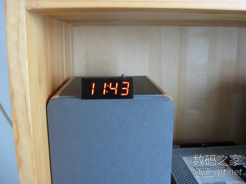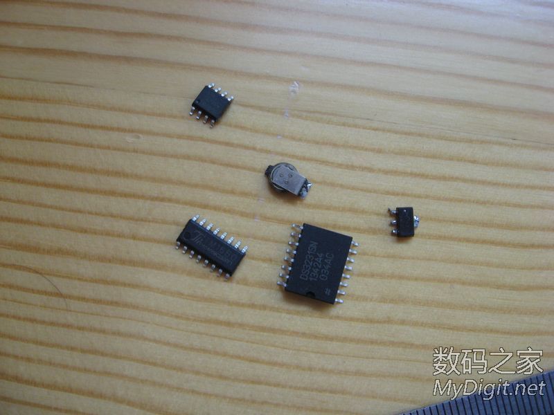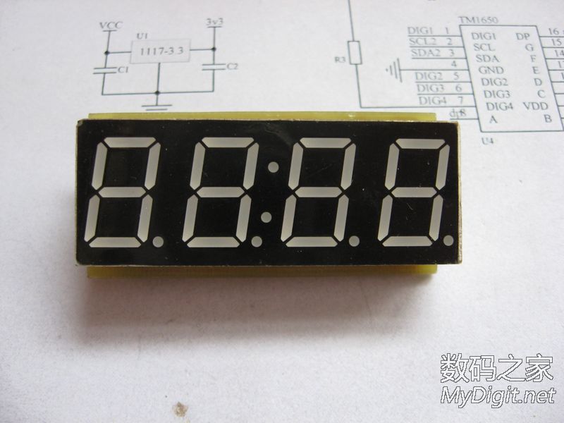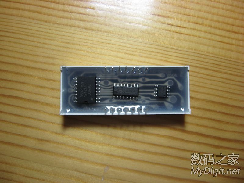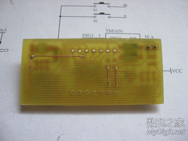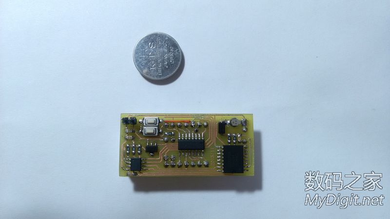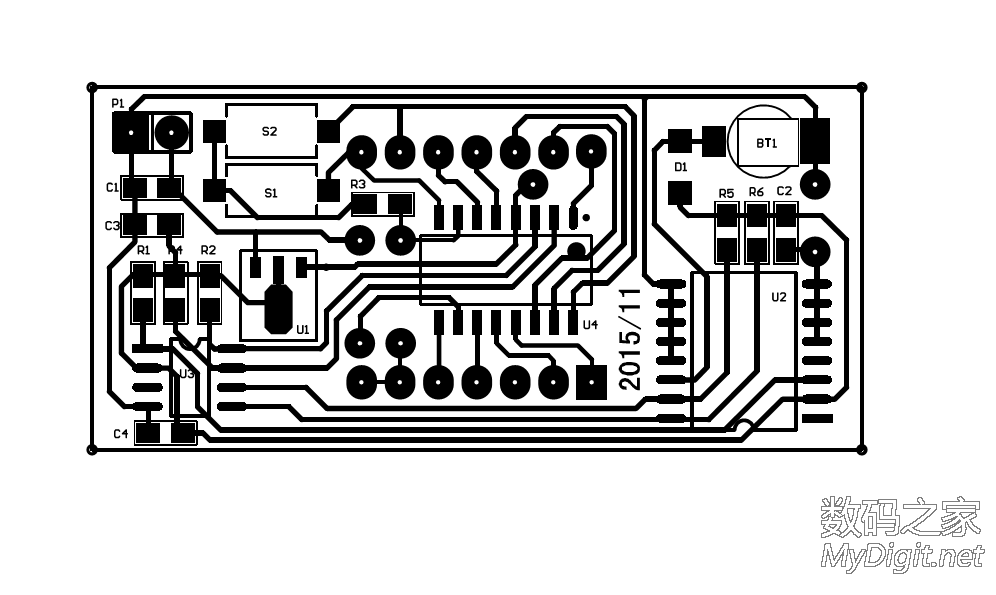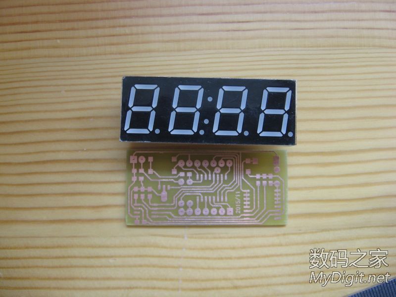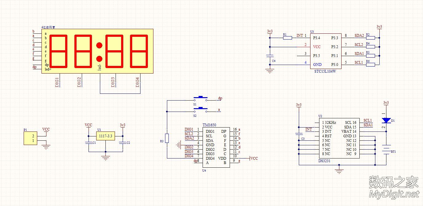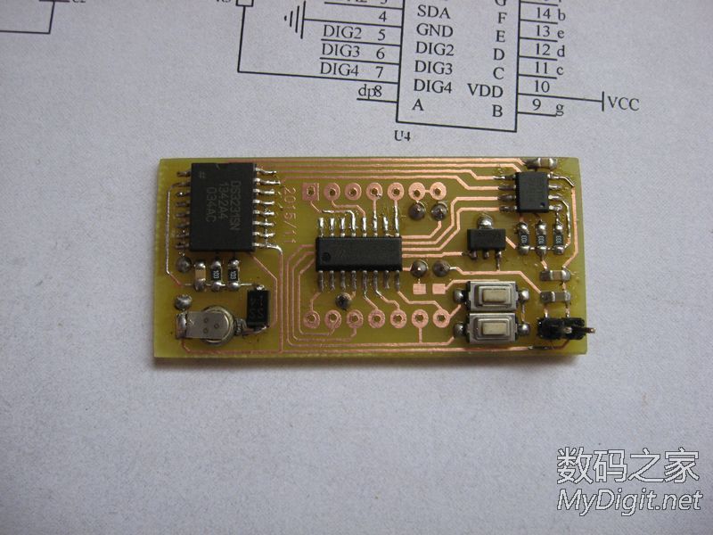 楼主是一名业余的单片机爱好者,从开始玩单片机到现在,做过不少的时钟。从最初的纯软件计时,到DS1302时钟芯片再到后来的GPS授时都做过。纯软件计时一断电就全归零了,完全没有实用价值;DS1302的好一些,有断电走时,但也存在走时不准的问题;GPS授时倒是准了,可是在室内使用信号不好,还要拖一根线到窗台或室外,显得不够简洁。于是把目光转向了美信的高精度时钟芯片DS3231(±2ppm ,年误差1分钟左右)。最近正好有空,就用它做了个实用的时钟。从器件手册上摘抄的DS3231介绍:DS3231 是低成本、高精度 I2C实时时钟 (RTC),具有集成的温补晶体振荡器 (TCXO) 和晶体。该器件包含电池输入端,断开主电源时仍可保持精确的计时。集成晶体振荡器提高了器件的长期精确度。 DS3231采用 16引脚、300mil的 SO封装。RTC 保持秒、分、时、星期、日期、月和年信息。少于31 天的月份,将自动调整月末日期,包括闰年补偿。时钟的工作格式可以是 24 小时或带 AM/PM 指示的 12 小时格式。提供两个可编程日历闹钟和一路可编程方波输出。地址与数据通过 I2C双向总线串行传输。精密的、经过温度补偿的电压基准和比较器用来监视 VCC状态,检测电源故障、提供复位输出,并在必要时自动切换到备用电源。另外, RST监视引脚可以作为手动按钮输入以产生外部复位信号。特性♦0°C 至 +40°C 范围内精度为 ±2ppm♦-40°C 至 +85°C 范围内精度为 ±3.5ppm♦为连续计时提供备用电池输入♦低功耗♦实时时钟提供秒、分、时、星期、日期、月、年信息,并提供有效期到 2100 年的闰年补偿♦两个日历闹钟♦可编程方波输出♦快速 (400kHz) I2C 接口♦3.3V工作电压♦数字温度传感器输出:精度为 ±3°C实物:来自万能的淘宝,不知真假显示部分使用TM1650驱动4位0.56寸的共阴极数码管。TM1650是天微生产的一款数码管驱动,2线串行驱动,8级亮度调整,并且支持28个按键扫描。只要把要显示的数据写入其中就能正确的显示了,不用再去写动态扫描的函数,硬件连接也更简单。用起来很方便。MCU的选用:先算了下I/O的占用,I2C 接口2个,TM1650 2个,DS3231的SQW1个(1HZ方波用于刷新显示)。这样仅仅用了5个I/O口,配合DS3231的3.3V供电,就选用了手头现成的STC 15L104W单片机。IC选好后,发现如果用贴片元件的话,和数码管差不多大小的PCB就能放得下。原理图(点击图片放大):画好的PCB:热转印制板:焊接完成:完成后的样子: 大小控制的不错吧裁一片亚克力板:最终的成品正常服役中,精度待测试后记:程序很简单,互联网上有现成的DS3231和TM1650的函数,稍微改一下就能用了。DS3231的SQW口输出1HZ方波,单片机在方波的每个下降沿产生中断然后读取DS3231的时间,再发送到TM1650的显示寄存器去刷新数码管的显示就行了。放置了2个按键用来调节时间。所用的单片机没有AD,不好实现自动亮度,只好靠时间去判断,白天亮度高晚上亮度低,用起来也很不错。DS3231的后备电源原来打算用手机上拆的备份电池,但实际证明不好用,试过断电时间超过2个小时就不能保存时间了。后来焊接了一片1.5V的纽扣电池,断电后可以正常的走时了。由于是自己制板,受单面PCB的限制,布线颇费了一番周折。不过每天看到自己的“作品”正常的工作,还是很有成就感的。